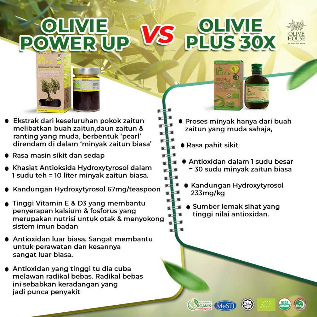 Olivie Plus 3ox diproses dari buah zaitun hijau sahaja berbanding dengan Olivie Power up yang diproses daripada buah , daun, ranting pokok zaitun.