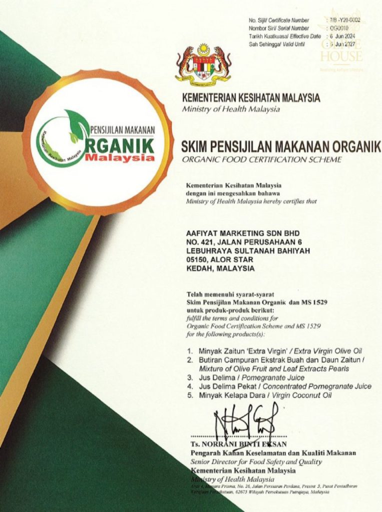 Mendapat pengiktirafan Organik daripada Kemennterian Kesihatan Malaysia (KKM) , ‘United States Department of Agriculture’ (USDA) dan ‘European Union’ (EU)